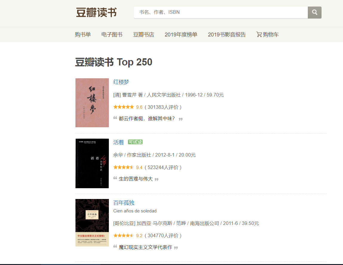 #数据持久化 with open('豆瓣top250.csv',mode='w',newline='',encoding='utf-8') as f: writer = csv.writer(f) writer.writerow(['书名','作者','翻译者','出版社','出版日期','价格','评分','评价人数']) for i in range(10): print('页数'+str(i+1)) link = 'https://book.douban.com/top250?start=' + str(i*25) for i in get_one_page(link): writer.writerow(i)