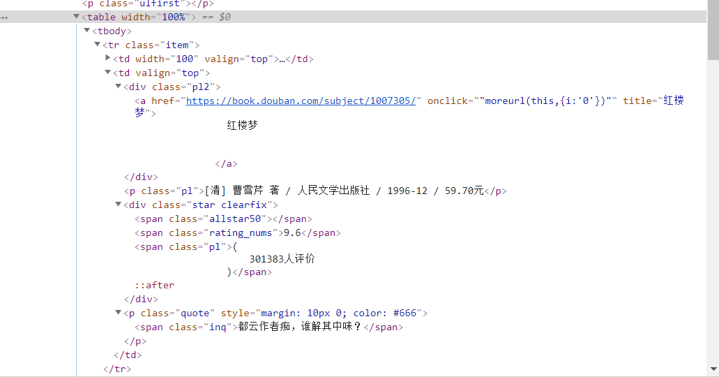 爬取数据都分布在标签'<div id="content">'里,书名标签为'div class="pl2"',评分标签为'span.class="rating_nums"等