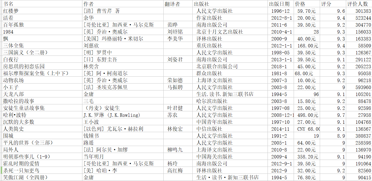 writer.writerow(['书名','作者','翻译者','出版社','出版日期','价格','评分','评价人数'])