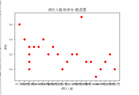 #绘制评价人数与评分散点图 def Scatter_point(): plt.scatter(df.价格, df.评分, color='red', s=25, marker="o") plt.xlabel("评价人数") plt.ylabel("评分") plt.title("评价人数与评分-散点图") plt.show() Scatter_point()