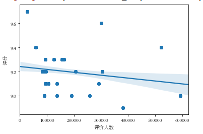 #绘制评价人数与评分的回归图 plt.rcParams['font.sans-serif']=['STSong']#显示中文 sns.regplot(df.评价人数,df.评分)