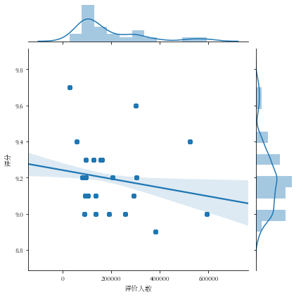 #绘制部分分布图 sns.jointplot(x="评价人数",y='评分',data = df, kind='re