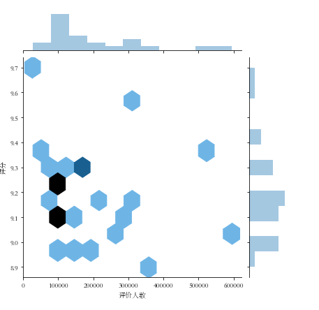 #绘制部分分布图 sns.jointplot(x="评价人数",y='评分',data = df, kind='kde', color='r') sns.jointplot(x="评价人数",y='评分',data = df) sns.jointplot(x="评价人数",y='评分',data = df, kind='reg') sns.jointplot(x="评价人数",y='评分',data = df, kind='hex')