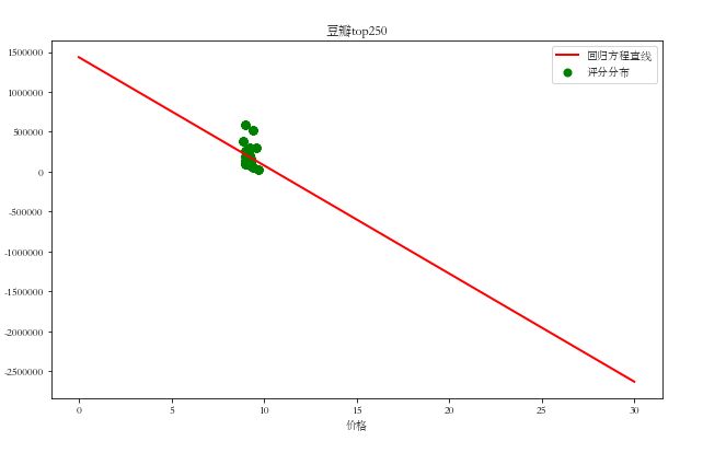 #绘制一元一次回归方程 import numpy as np from scipy.optimize import leastsq import pandas as pd def main(): colnames = ["价格", "评分"] df = pd.read_csv('豆瓣top250.csv',skiprows=1,names=colnames) X = df.价格 Y = df.评分 def func(p, x): k, b = p return k * x + b def error_func(p, x, y): return func(p,x)-y p0 = [0,0] Para = leastsq(error_func, p0, args = (X, Y)) k, b = Para[0] print("k=",k,"b=",b) plt.figure(figsize=(10,6)) plt.scatter(X,Y,color="green",label=u"评分分布",linewidth=2) x=np.linspace(0,30,20) y=k*x+b plt.plot(x,y,color="red",label=u"回归方程直线",linewidth=2) plt.title("豆瓣top250") plt.xlabel('价格') plt.ylabel('评分') plt.legend() plt.show() main()