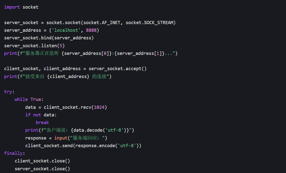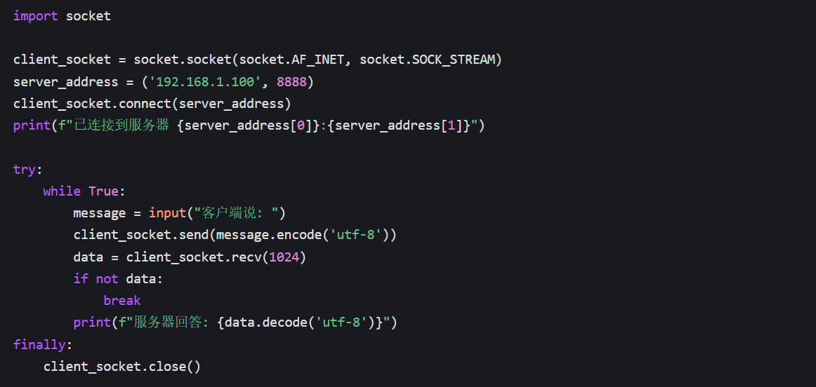 通过查阅资料,了解到 Python 中字符串与字节流的转换需要明确指定编码方式。在发送数据前使用encode('utf-8')方法将字符串转换为字节流,接收数据后使用decode('utf-8')方法将字节流转换为字符串,问题得到解决。