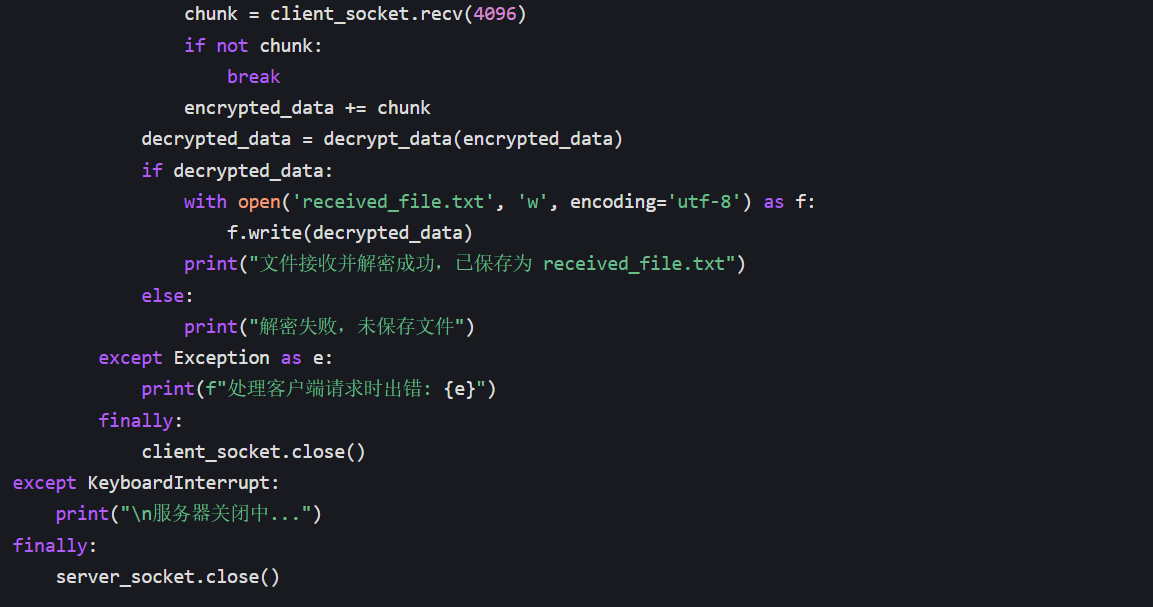 在基础通信功能的基础上,我引入了 AES 加密算法,实现了文件内容的加密传输和解密存储功能。客户端从文件读取内容,加密后发送给服务端;服务端接收密文,解密后保存到文件中。