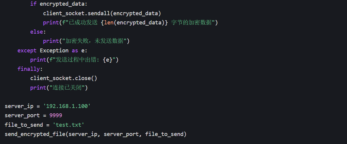 基础通信功能测试中,客户端和服务端能够成功建立连接,并实现了文本消息的双向传输。加密通信功能测试中,我们创建了一个包含测试内容的文本文件,客户端成功加密并发送该文件,服务端接收后解密并保存,经比对,解密后的文件内容与原始文件完全一致,证明加密和解密过程正确无误。