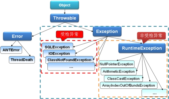 - 检查性异常(受检异常):最具代表的检查性异常是用户错误或问题引起的异常,这是程序员无法预见的。例如要打开一个不存在文件时,一个异常就发生了,这些异常在编译时不能被简单地忽略。