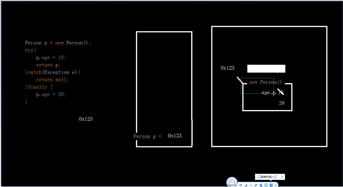 原因是:p是属于引用类型,对象存在堆里面,栈里面新备份的是引用的地址,所以finally执行后引用的地址没变,对应的值变了;