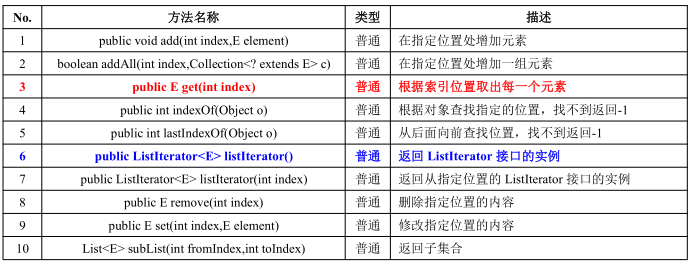 在 List 接口中有以上 10 个方法是对已有的 Collection 接口进行的扩充。
