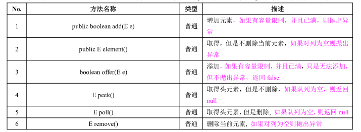 此类继承了 AbstractList,所以是 List 的子类。但是此类也是 Queue 接口的子类,Queue 接口定义了如下的方法: