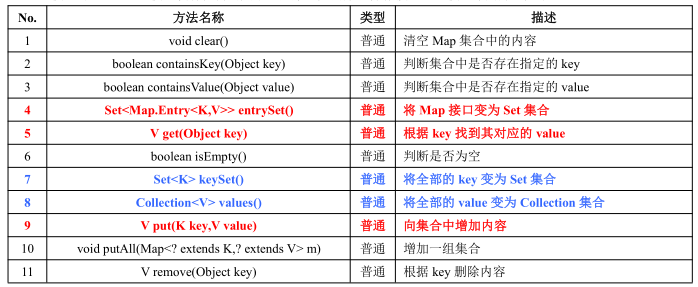 此接口与 Collection 接口没有任何的关系,是第二大的集合操作接口。此接口常用方法如下: