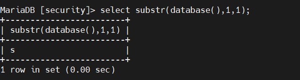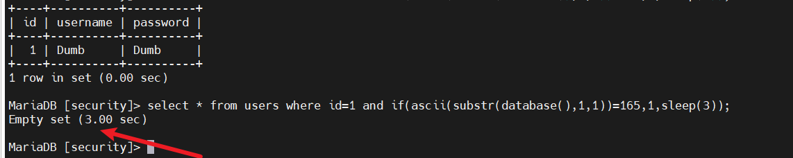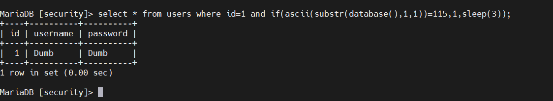 MariaDB [security]> select * from users where id=1 and if(ascii(substr(database(),1,1))=115,1,sleep(3));