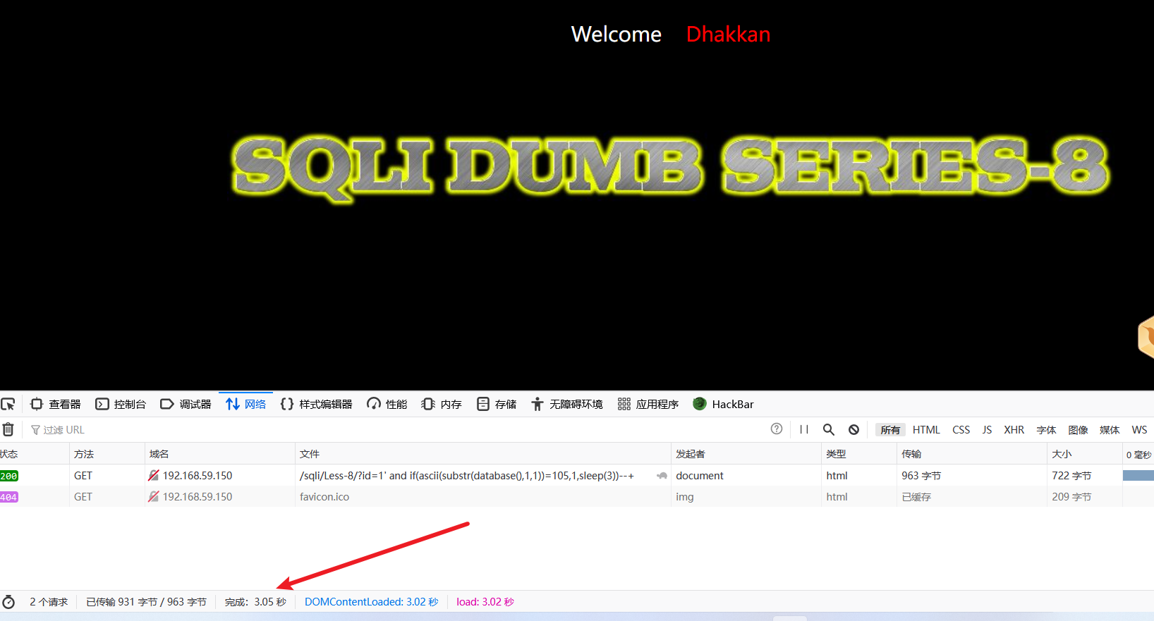 http://192.168.59.150/sqli/Less-8/?id=1' and if(ascii(substr(database(),1,1))=115,1,sleep(3))--+