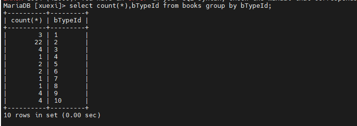 select count(*),bTypeId from books group by bTypeId;//以bTypeId 计数