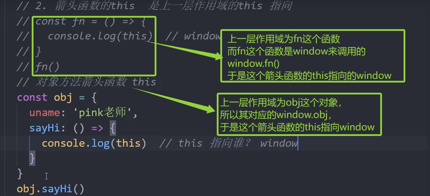 箭头函数自身并没有this,箭头函数所指向的this为上一级作用域的this