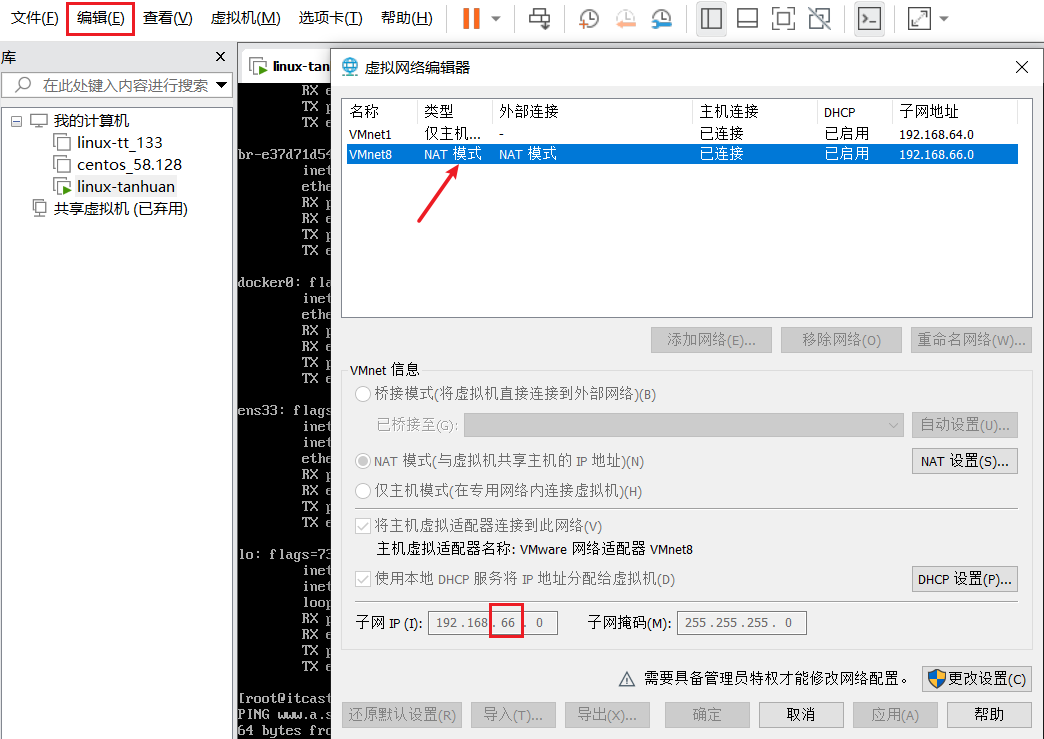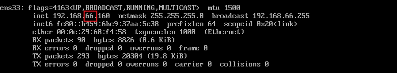 2.linux输入命令ifconfig,查看linux机器的ip地址,保证这里的第3位与虚拟机的网关的第3位一致