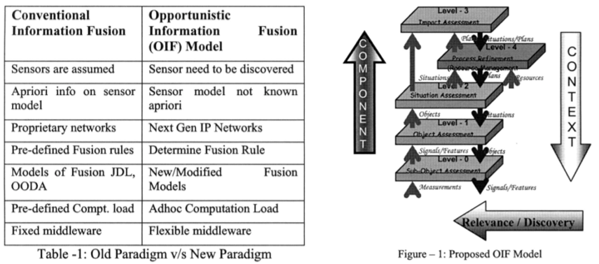 在传统的信息融合中,JDL是最常用的模型,尤其在国防应用中,该模型将数据融合过程分解为0-4个层次,包括传感器信号处理,目标细化和跟踪,使用适当数据库增强态势、威胁和影响的评估,融合规则。JDL模型一个基本隐含假设是,传感器和相应的传感器模型是先验一直的,并且以专用的方式服务于特定的应用程序。因此,数据融合系统一旦被开发出来,就不能被重新部署服务于被构建的环境。当传感器、计算和通信称为共享基础设施,而没有合适的数据融合应用时,这种模型就不再适用了。