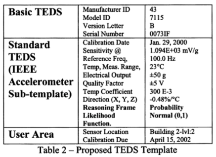 从贝叶斯融合规则中可以看出,似然信息需要直接从在发现中的传感器中收集。有时可以近似似然函数通过TEDS模板中现有的标准TEDS信息和传感器服务于信息融合应用的生成数据。但是这样的派生函数充其量只是近似,并可能导致错误的融合结果。由于这是真实的传感器误差特性,并且是传感器制造商的专有信息,所以最好是作为标准的一部分,并由传感器提供或制造商直接提供作为标准TEDS模板的一部分。由于目前批准的标准没有包含此类不确定描述函数,建议对标准TEDS字段进行以下整改,实现机会性信息融合,如图中粗体显示。