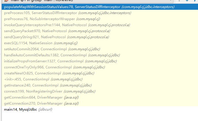 3.NativeProtocol类sendQueryPacket可见,先执行queryInterceptors的preProcess方法。所以进入ServerStatusDiffInterceptor的populateMapWithSessionStatusValues方法。