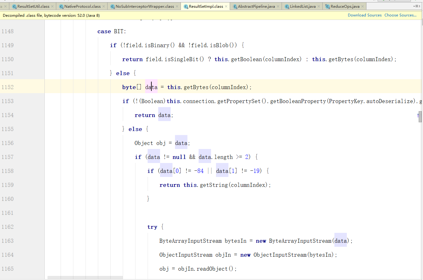 6.跟进后会执行rs.getObject逻辑,需要保证返回的数据是block才能触发反序列化。如下逻辑,需要为blob,autoDeserialize参数为true和data[0] != -84 || data[1] != -19