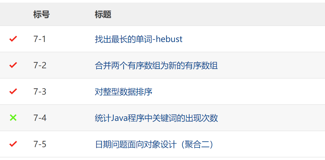 题目描述:题目集4(7-1 水文数据校验及处理 ),题目集5(7-1 找出最长的单词-hebust ,7-4 统计Java程序中关键词的出现次数 ),题目集6(7-1 正则表达式训练-QQ号校验,7-3 正则表达式训练-验证码校验,7-4 正则表达式训练-学号校验)。