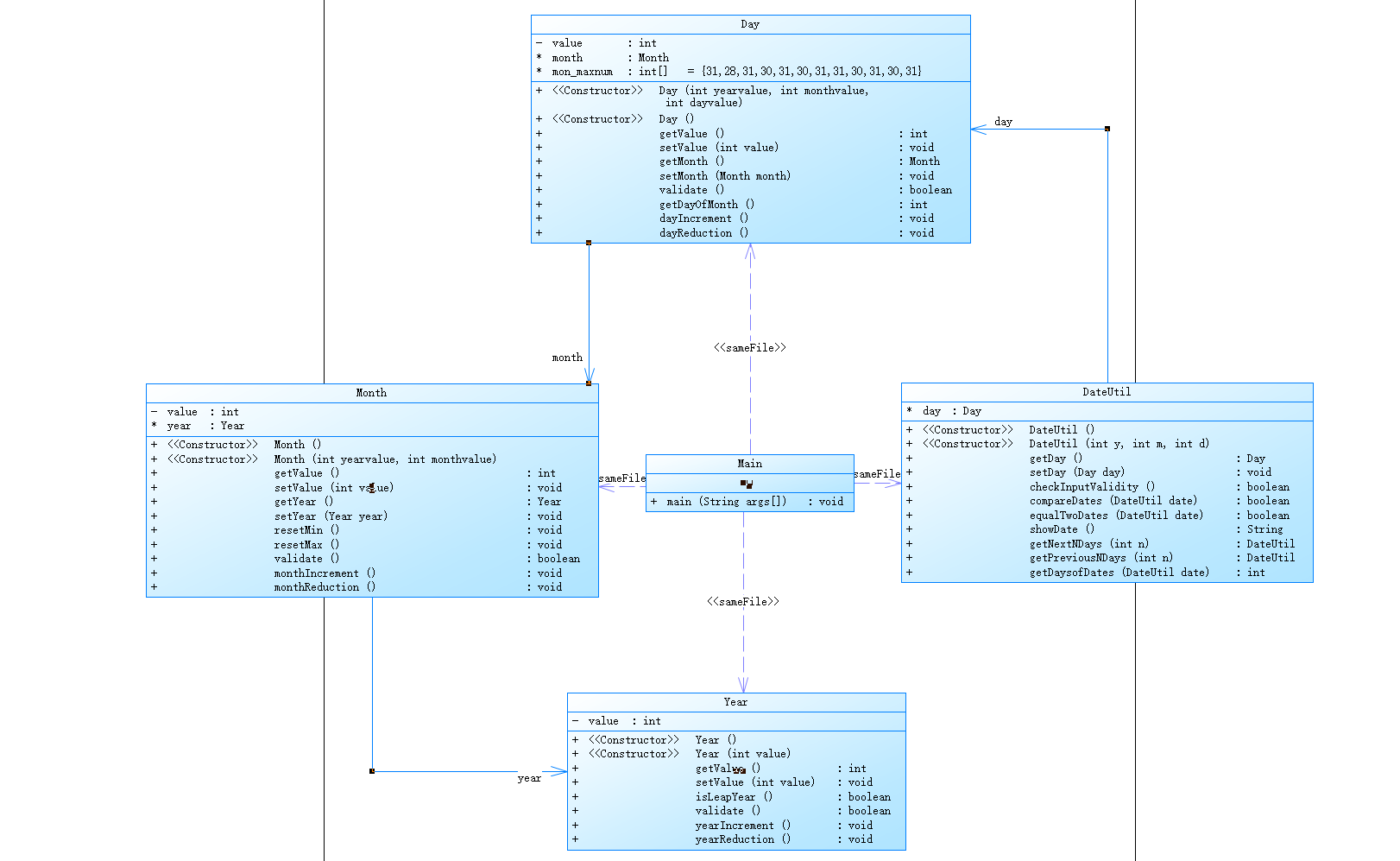 题目集4(7-2)和题目集5(7-5)题目需求一样,都需要求出对应的日期,但是题目要求使用的类之间的关系不同,写出后类关系图如下