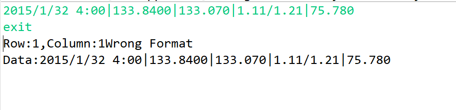 1 public class Main { 2 public static void main(String[] args) { 3 Scanner scan = new Scanner(System.in); 4 5 LocalDateTime measurDatatime ; 6 double objectWaterlever ; 7 double actualWaterlever ; 8 double objectGateOpening ; 9 double actualGateOpening ; 10 double waterFlow ; 11 12 String str ; 13 List<String> s = new ArrayList<String>(); 14 str = scan.nextLine(); 15 String sub="exit"; 16 int cmp=str.compareTo(sub); 17 while(cmp!=0) 18 { 19 s.add(str); 20 str=scan.nextLine(); 21 cmp=str.compareTo(sub); 22 } 23 24 25 for (int i = 0; i < s.size(); i++) { 26 27 String[] a = s.get(i).split("\\|"); 28 29 String[] col45 = a[3].split("\\/"); 30 String data = "((([1-9]{1}|[1-9][0-9]{1}|[1-9][0-9]{2}|[1-9][0-9]{3})/((([13578]|1[02])/([1-9]|[12][0-9]|3[01]))|(([469]|11)/([1-9]|[12][0-9]|30))|(2/([1-9]|[1][0-9]|2[0-8]))))|((([1-9]{0,1}[0-9]{0,1})(0[48]|[2468][048]|[13579][26])|((0[48]|[2468][048]|[3579][26])00))/2/29)) ([02468]|1[02468]|2[02]):00"; 31 32 if(!a[0].matches(data)) { 33 System.out.println("Row:"+(i+1)+",Column:1Wrong Format"); 34 System.out.println("Data:"+s.get(i)); 35 } 36 37 } 38 39 } 40 }