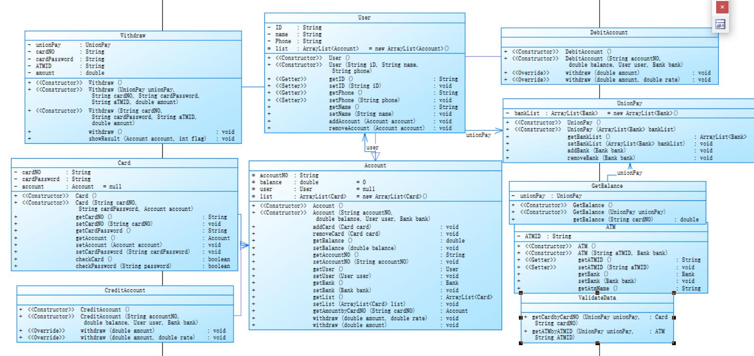 代码设计: 本次题目难度较大需要解决的问题比较多,比如每个类之间的关系,如何存储个人账户信息,读取时又如何返回相应的信息。思考良久后决定了用以下方法进行信息存储