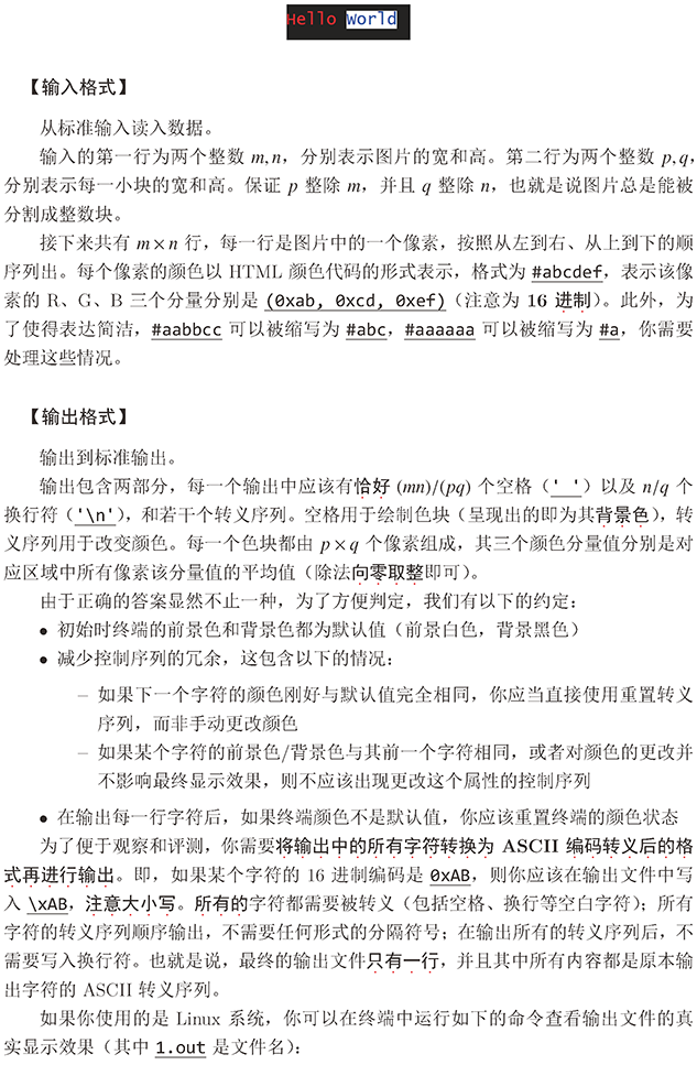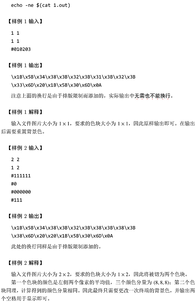 题目大概意思就是:将图片切割成小图片,每个小图片用一个色块块,色块的颜色取小图片内所有像素的均值(向下取整),按他的编码输出。