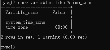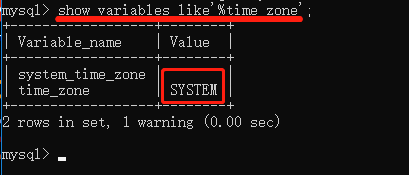 继续输入 show variables like'%time_zone'; (注意不要漏掉后面的分号),回车,如图:
