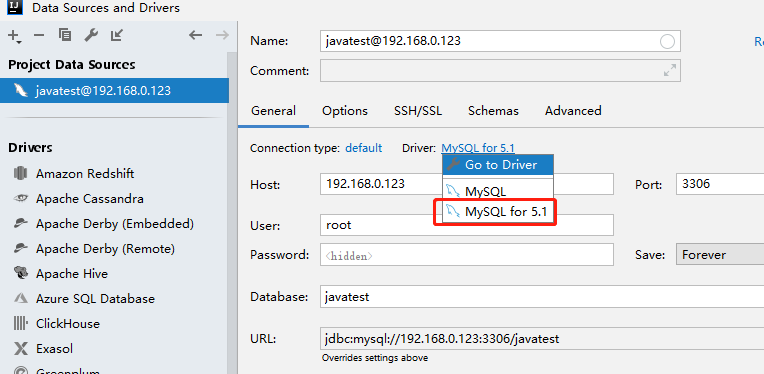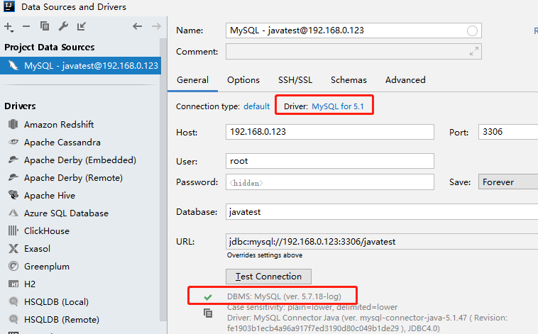 我本机安装的mysql版本是5.7的,那么IDEA要连接mysql也应该匹配下驱动版本。把Driver改成MySQL for 5.1就可以了。