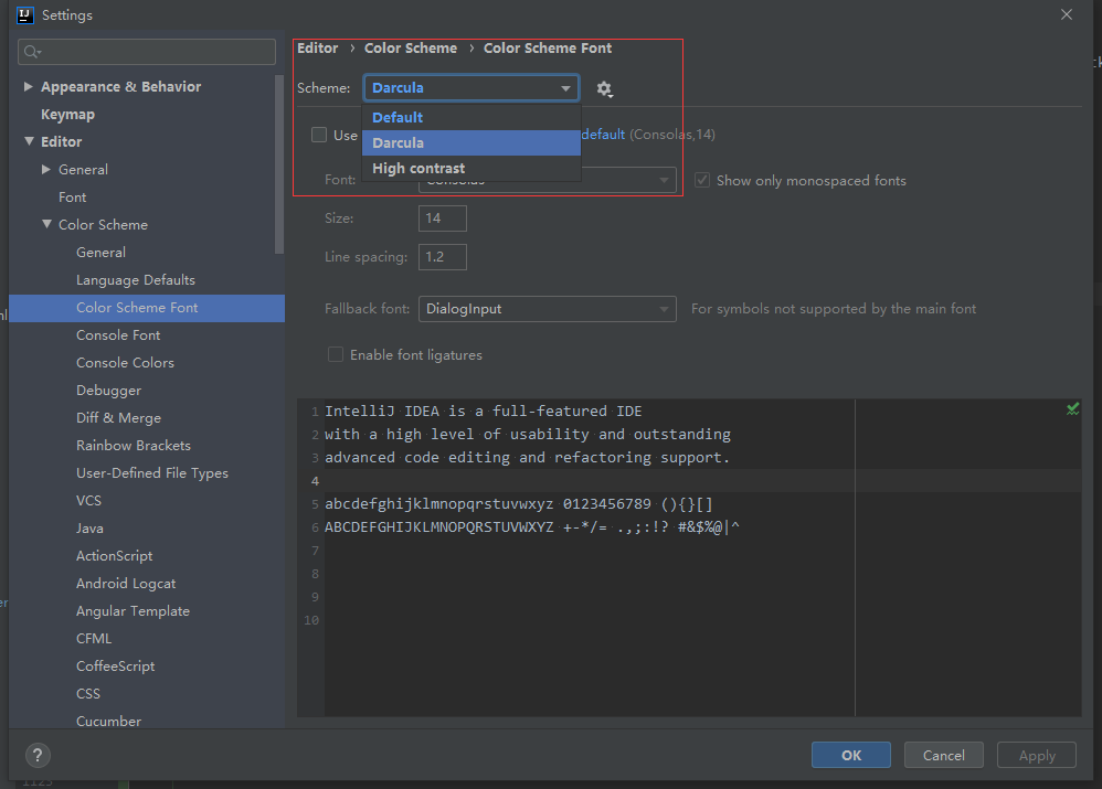 设置:File - Settings - Editor - Color Scheme Font 里面的 Scheme:
