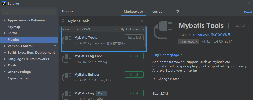 (根据idea的不同版本,插件可能叫 Mybatis Tools 或 Free Mybatis Plugin)