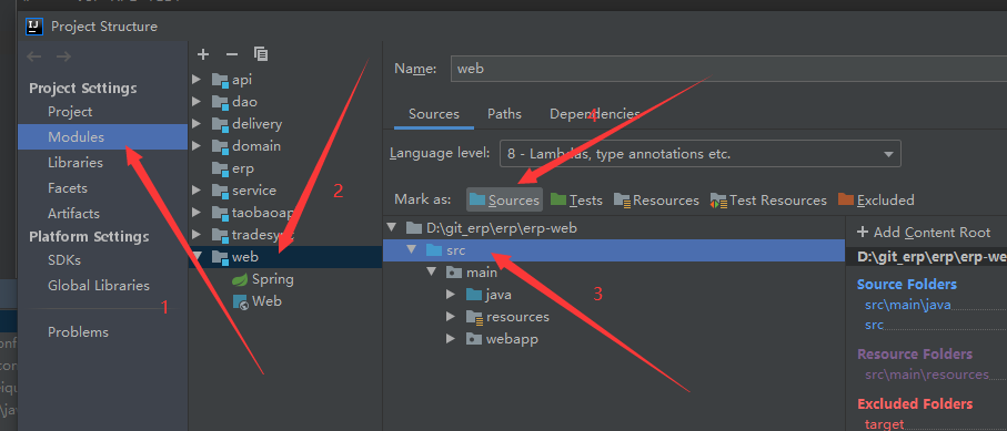 步骤二:依次点击:Modules-web-src-Sources,重启IDEA即可