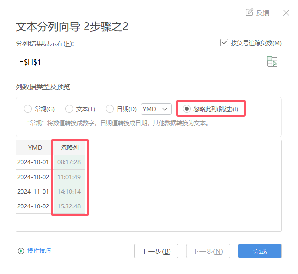 向导步骤二选中第一列,设置为日期,选中第二列,选择“忽略此列”,点击完成即可