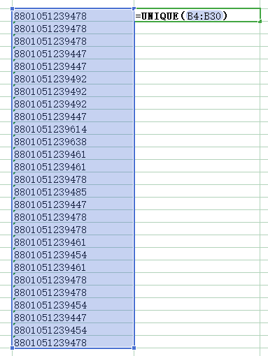 在要生成的列第一个单元格输入“=UNIQUE(B1:B25)”,第一个参数是被检测列第一个单元格所在坐标,第二个参数是被检测列最后一个单元格所在坐标,回车即可