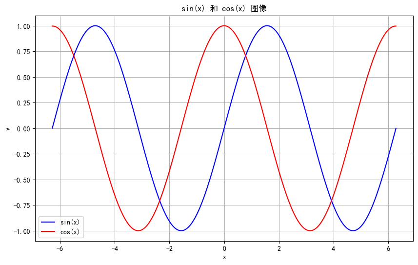 plt.figure(figsize=(10, 6)) plt.plot(x_values, sin_values, label=r'$\sin(x)$', color='b') plt.plot(x_values, cos_values, label=r'$\cos(x)$', color='r') plt.title(r'$\sin(x)$ 和 $\cos(x)$ 图像') plt.xlabel('x') plt.ylabel('y') plt.legend() plt.grid(True) plt.show()这里使用
