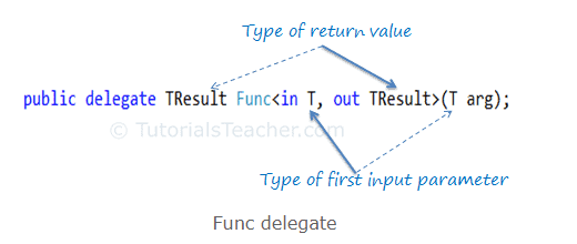 - Func delegate type can be used with an anonymous method or lambda expression.