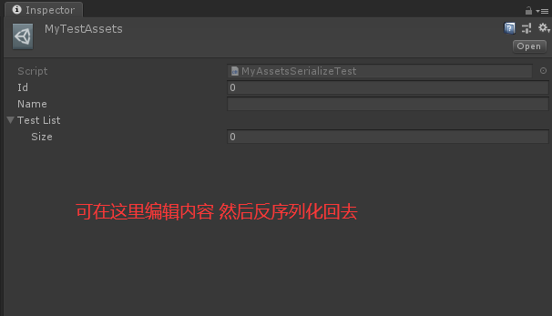 using System.Collections.Generic; using UnityEngine; // asset 想要被序列化 必须继承自 ScriptableObject 不需要加任何序列化的标签 [CreateAssetMenu(fileName = "MyTestAssets", menuName = "MyCreateAssets", order = 0)] public class MyAssetsSerializeTest : ScriptableObject { public int Id; public string Name; public List<string> TestList; }