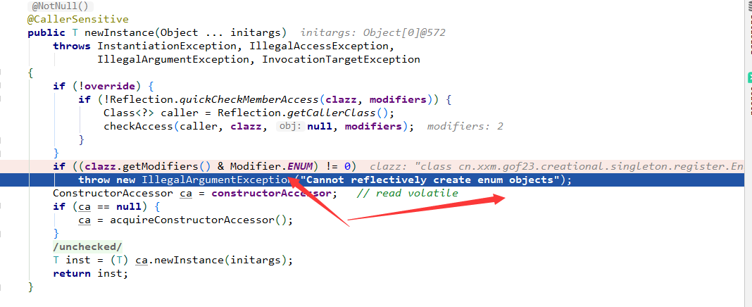 不能反射式地创建枚举对象,这是JDK为枚举天然保驾护航,保障其单例性