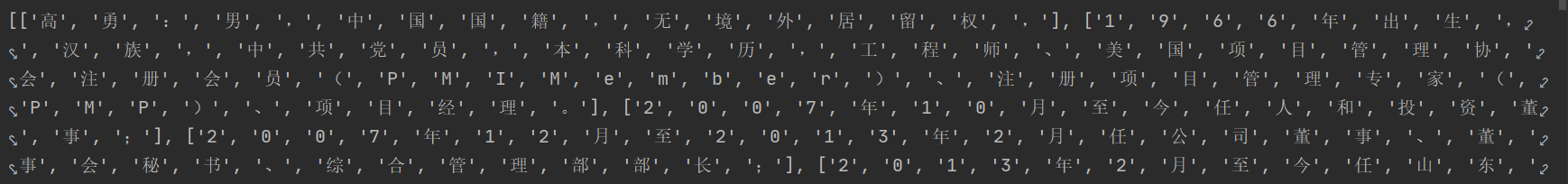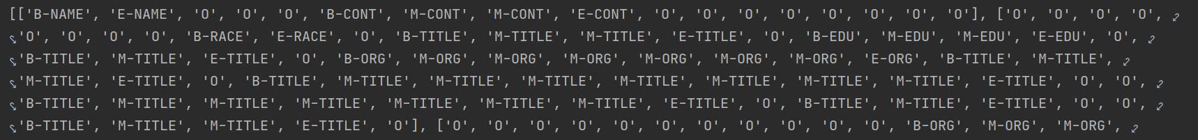 输出的pred_tag_lists[0]与test_tag_list[0]如下:可以看到还是一致的,那么所有的tag的准确率有多少呢?