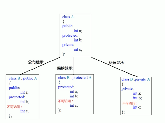父类中所有非静态成员属性都会被子类继承下去,父类的私有成员属性,是被编译器给隐藏了,因此是访问不到,但是确实被继承下去了