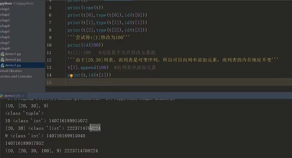 (t=(10,[20,30],9) 这里t只想一个元组 元组有三个引用指向,两个分别是不可变对象10 和9 ,另一个是指向一个可变序列列表 列表指向两个不可变序 列20 30 ,引用不能更改 如果想要将指向列表的指针 指向一个新的对象是不可以的,但是可以在指向的列表之中添加新的元素