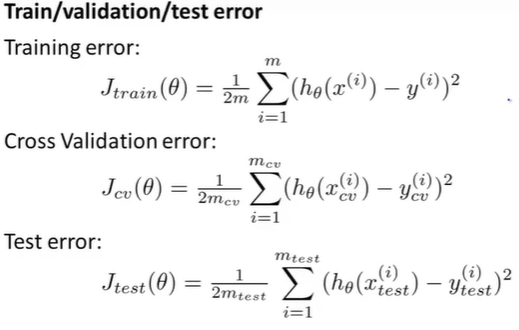 首先需要对训练集进行学习得到参数θ,也就是最小化训练误差J(θ),J是通过训练集得到的,接下来得到测试误差J(θ)test,把从训练集中学习得到的参数θ放到J(θ)test中计算测试误差