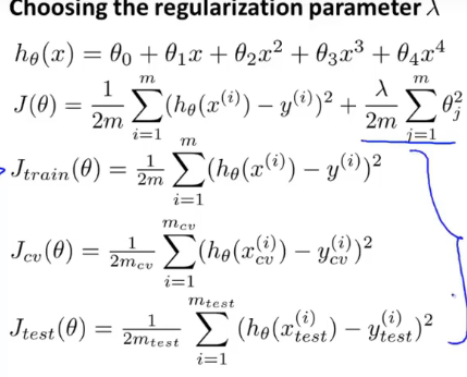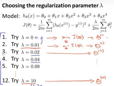 下面的三个式子在代价函数中已有正则项的情况下,表示的是平均的平方和误差,那么选取合适的入的值得方法是选取一系列想要尝试的入的值,首先考虑不使用正则化,将步长以两倍速增长,选取入的值最小化J(θ)得到θ1,以此类推