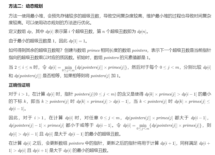 class Solution { public int nthSuperUglyNumber(int n, int[] primes) { int[] dp = new int[n + 1]; dp[1] = 1; int m = primes.length; int[] pointers = new int[m]; Arrays.fill(pointers, 1); for (int i = 2; i <= n; i++) { int[] nums = new int[m]; int minNum = Integer.MAX_VALUE; for (int j = 0; j < m; j++) { nums[j] = dp[pointers[j]] * primes[j]; minNum = Math.min(minNum, nums[j]); } dp[i] = minNum; for (int j = 0; j < m; j++) { if (minNum == nums[j]) { pointers[j]++; } } } return dp[n]; } }