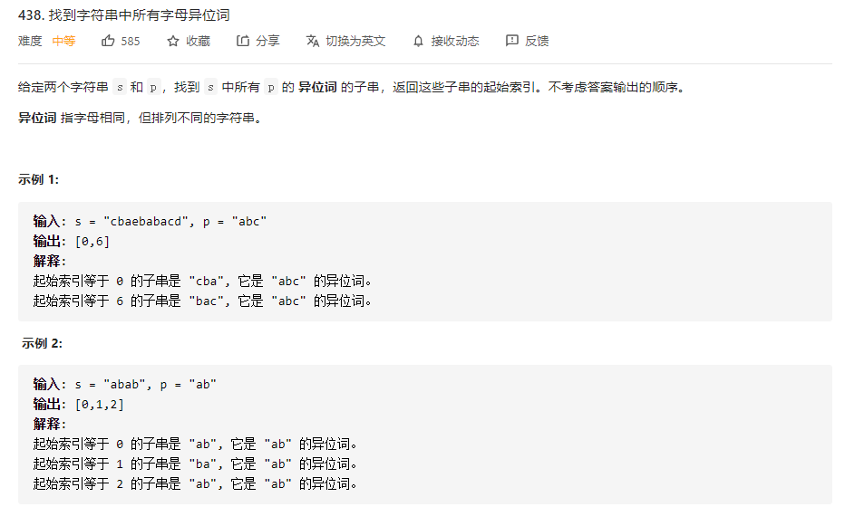 public List<Integer> findAnagrams(String s, String p) { List<Integer> res=new ArrayList<>(); Map<Character,Integer> need=new HashMap<>(); Map<Character,Integer> window=new HashMap<>(); int left=0,right=0,start=0; int index=0; int valid=0; char [] pCharArray=p.toCharArray(); for(char c:pCharArray) { need.put(c,need.getOrDefault(c,0)+1); } while(right<s.length()) { char r=s.charAt(right); right++; if(need.containsKey(r)) { window.put(r,window.getOrDefault(r,0)+1); if(window.get(r).equals(need.get(r))) valid++; } while(right-left>=p.length()) { if(valid==need.size()) res.add(left); char l=s.charAt(left); left++; if(need.containsKey(l)) { if(window.get(l).equals(need.get(l))) valid--; window.replace(l,window.get(l)-1); } } } return res; }