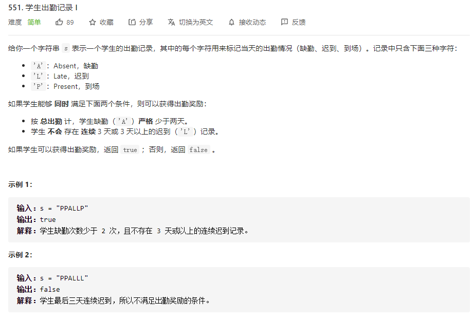 public boolean checkRecord(String s) { int asum=0; int index=0; for(int i=0;i<s.length();i++) { if(s.charAt(i)=='L') { if(++index>=3) return false; } else index=0; if(s.charAt(i)=='A') if(++asum>=2) return false; } return true; }